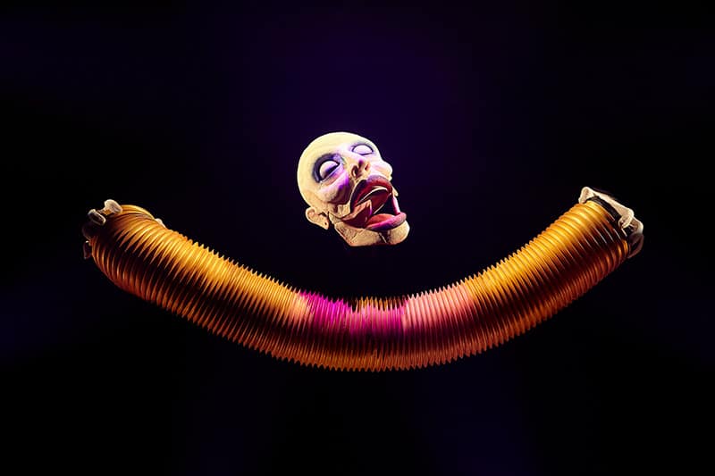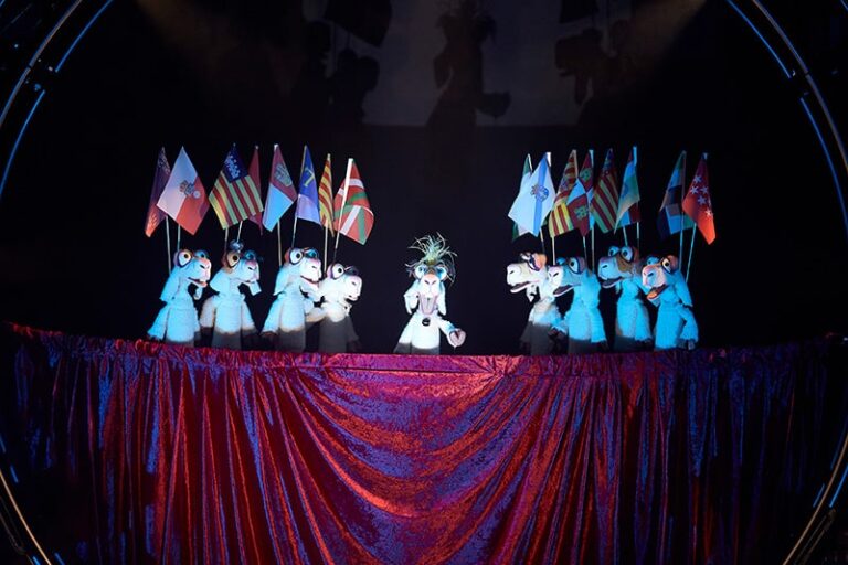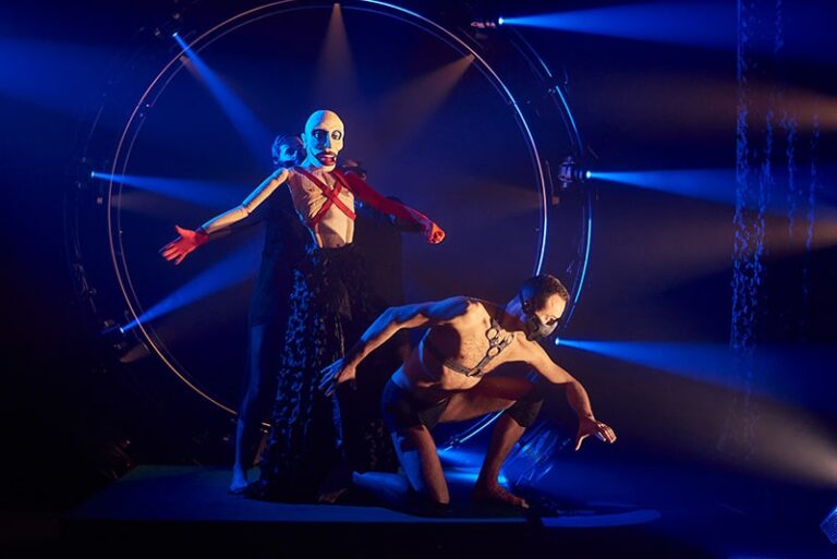 Un andrógino y extravagante personaje salido de las tinieblas, ayudado por tres marionetistas, nos sumergirá en un mundo paralelo desde el otro lado del cristal.